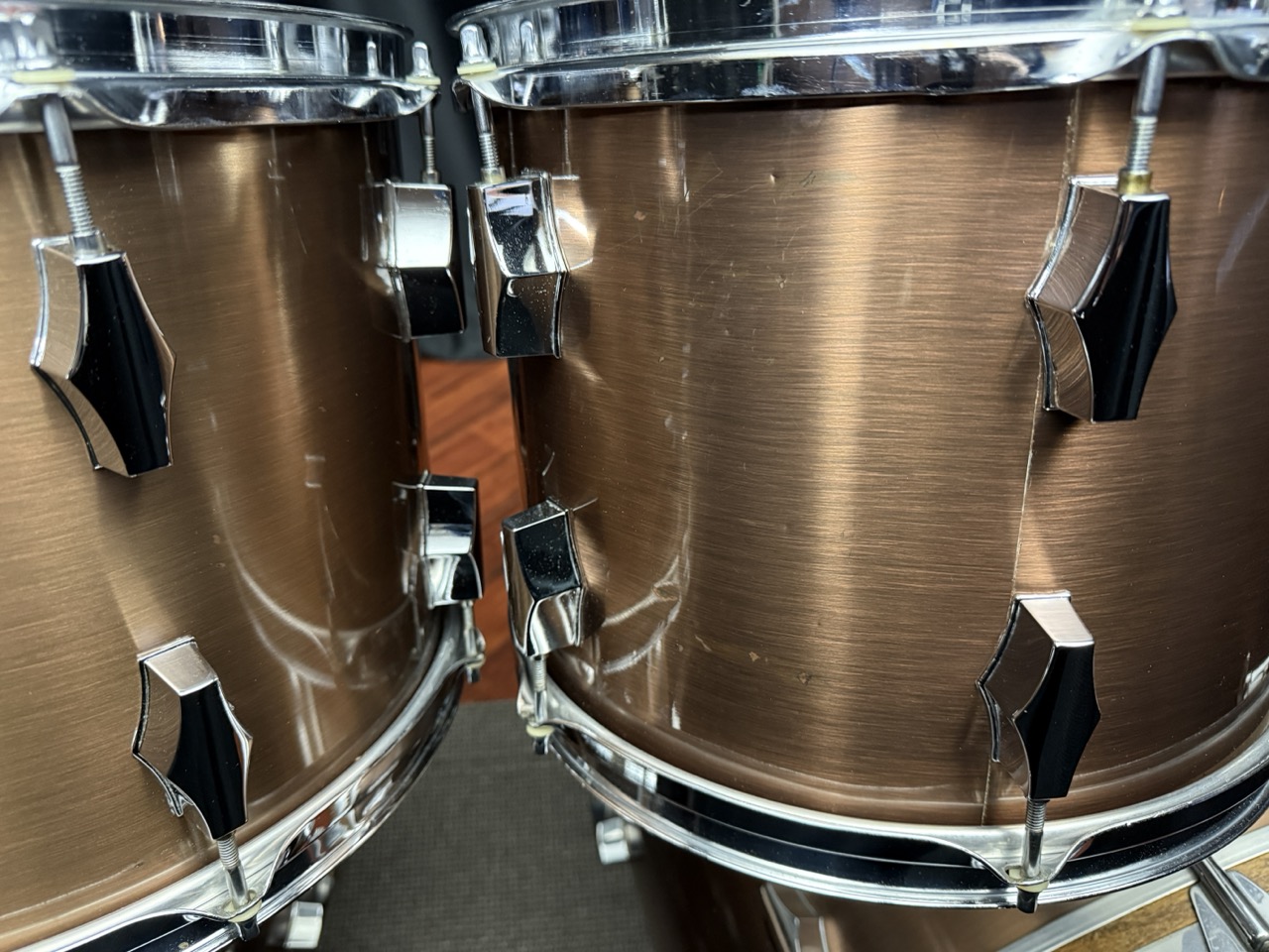 Sizes (depth x Diameter): 10×13, 10×14, 16×16 floor tom with legs, 2) 14×24 bass drums with original logo reso heads.
