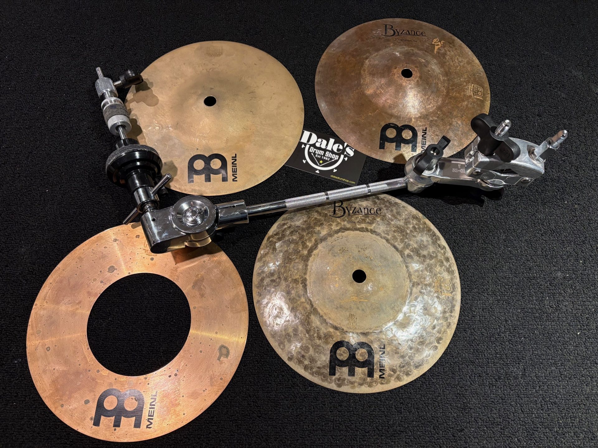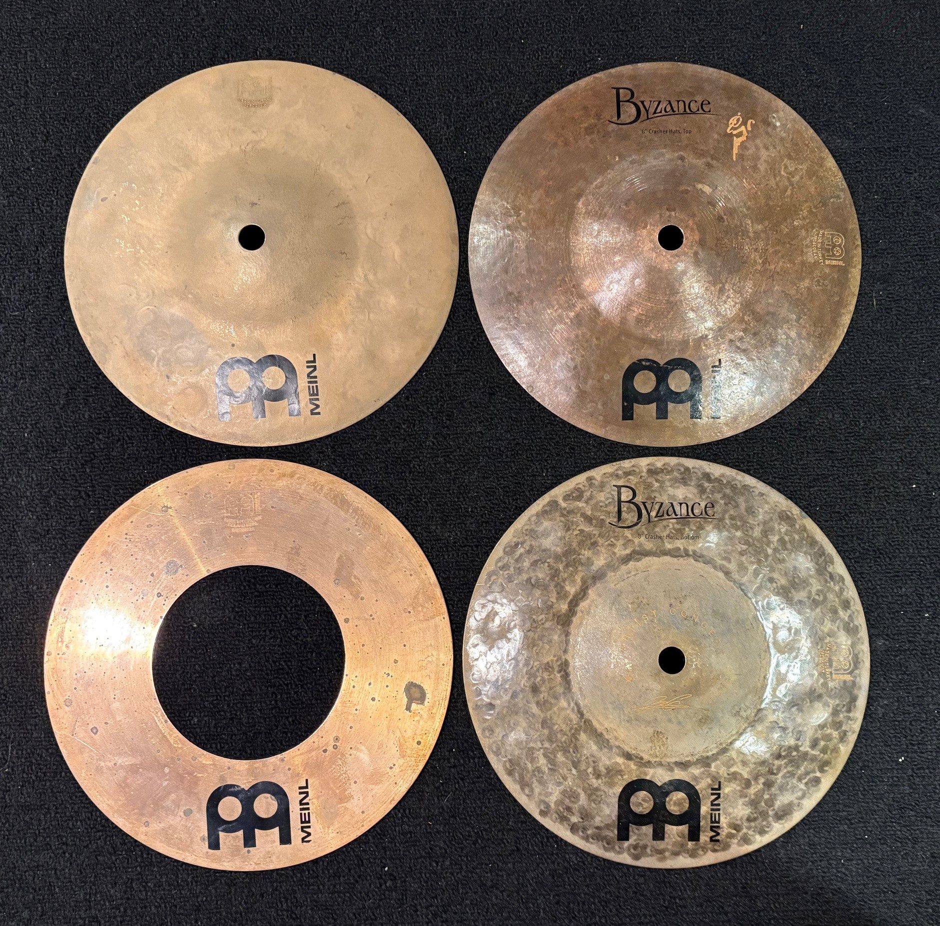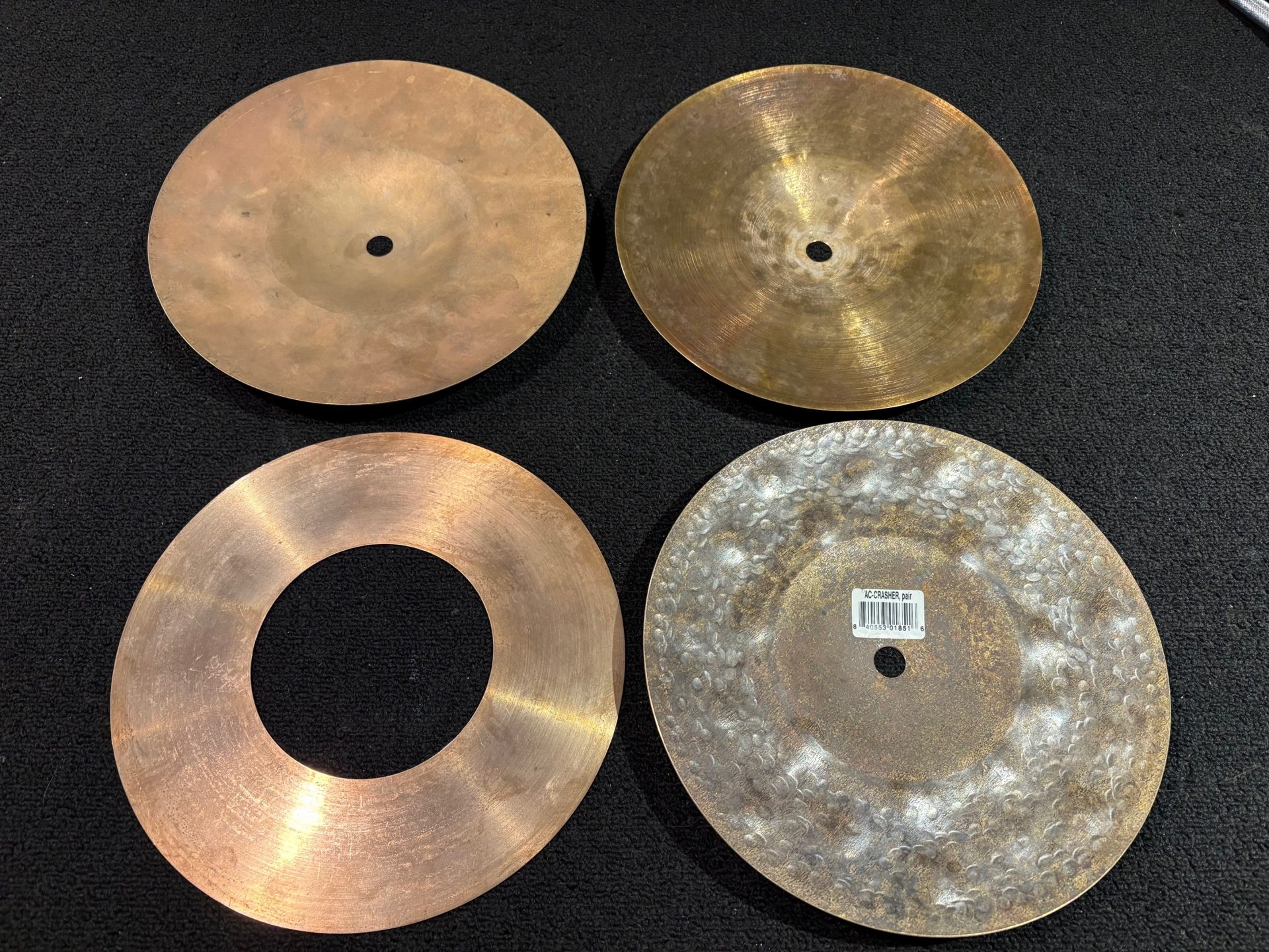 This used set is in very good condition. No dings, cracks, or keyholing. There is some oxidation on the donut cymbal. See pictures.