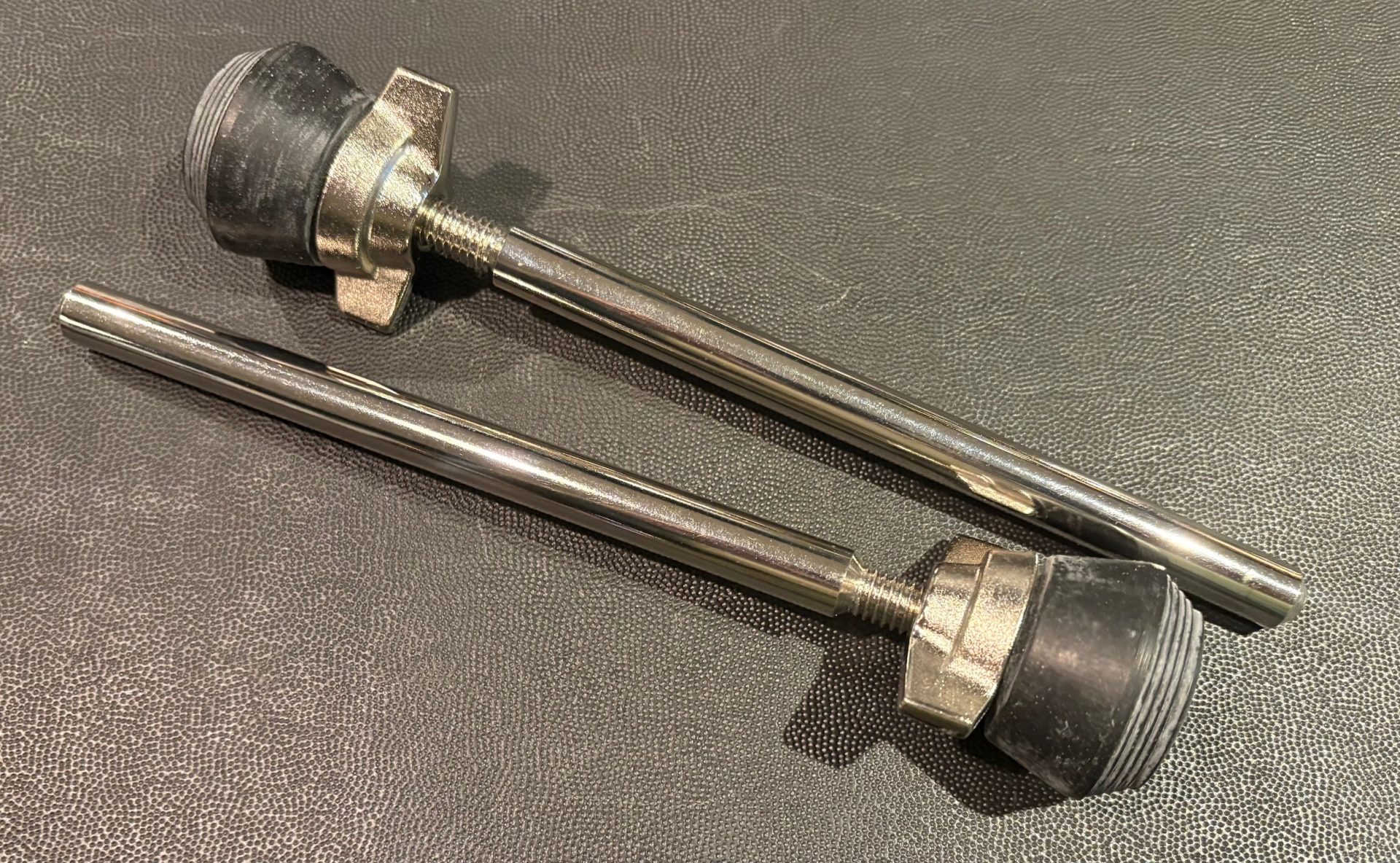 They include a threaded and spiked tip with large black rubber foot and a locking chrome wing nut.