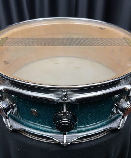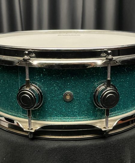 This is a used DW 5×14 Maple Snare Drum in Teal Glass Finishply.