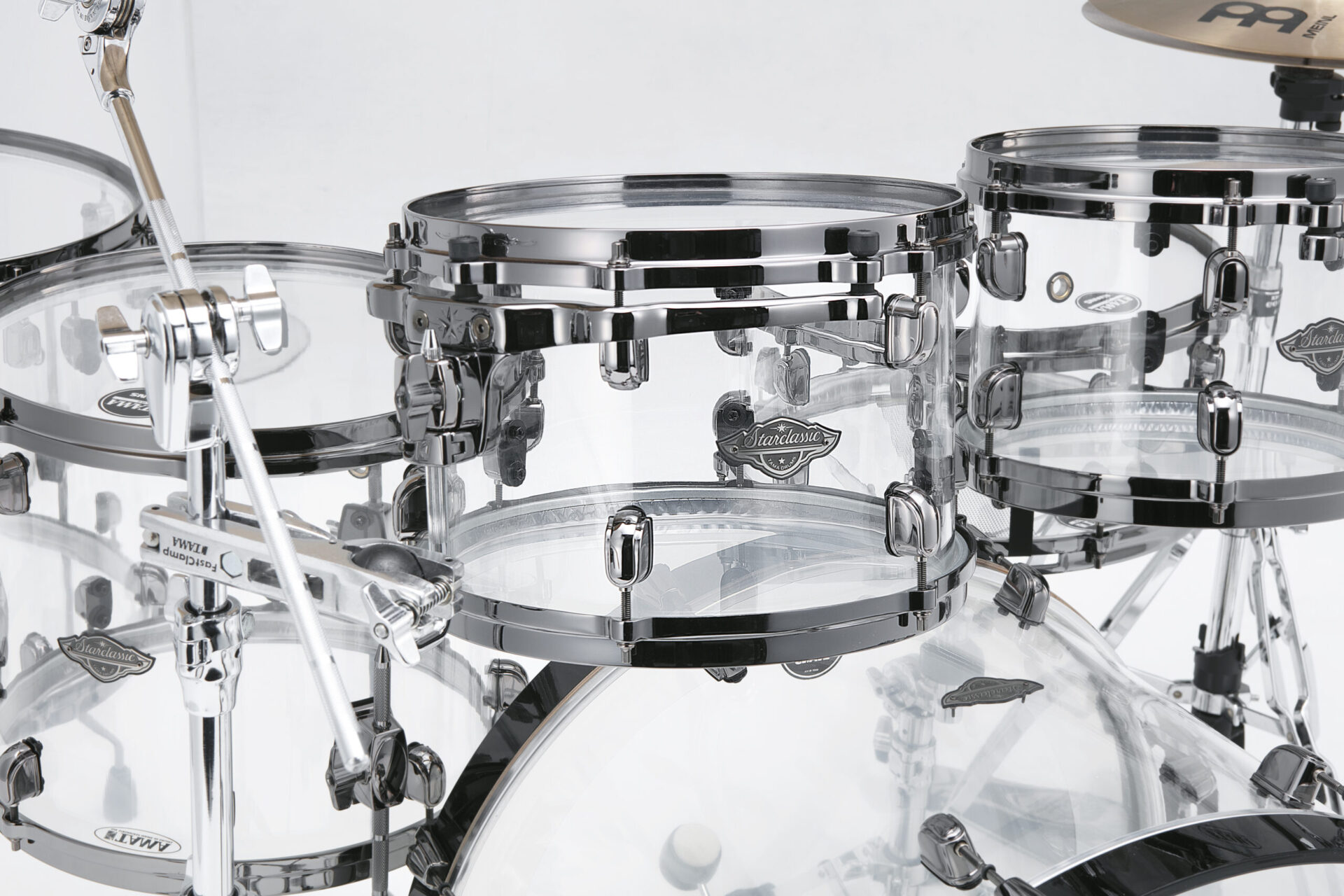 Evans Clear G2 batter heads and TAMA Clear Power Craft resonant heads provide professional tones with transparent vibe.